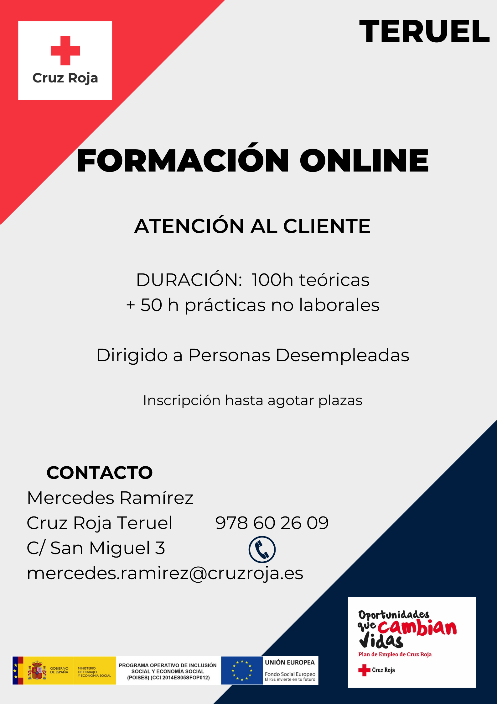 Desde el Proyecto ITINERARIOS QUE SUMAN de Cruz Roja Teruel vamos a comenzar el curso de “Atención al cliente” para personas desempleadas, de forma gratuita para todos los/as