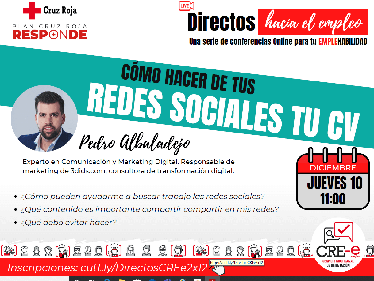 ¿Qué debes evitar en redes?Contaremos con el experto en comunicación y marketing digital Pedro Albaladejo, responsable de marketing de 3dids.com, consultora de transformación digital. Vendrá dispuesto a resolver todas nuestras dudas sobre el uso de tus redes sociales para tu búsqueda de e empleo. Si quieres tener un futuro como consultor seo