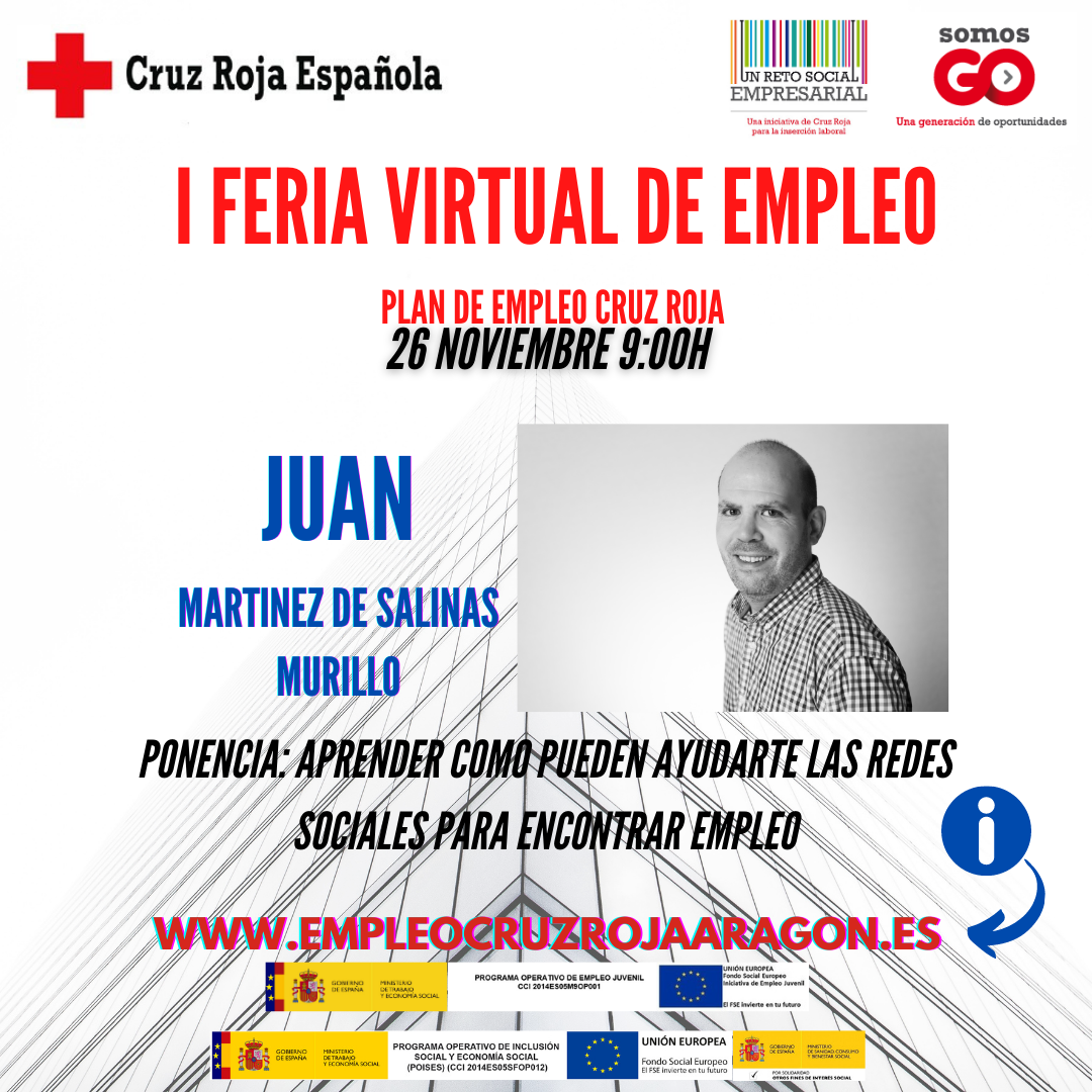 Hoy toca desvelar el nombre de una de las personas que realizarán ponencias en nuestra Feria Virtual de Empleo. El encargado de la primera ponencia será ni más ni menos que Juan Martínez de Salinas, quién realizará una interesantísima ponencia titulada, «En las redes sociales no busques empleo, sino oportunidades»
