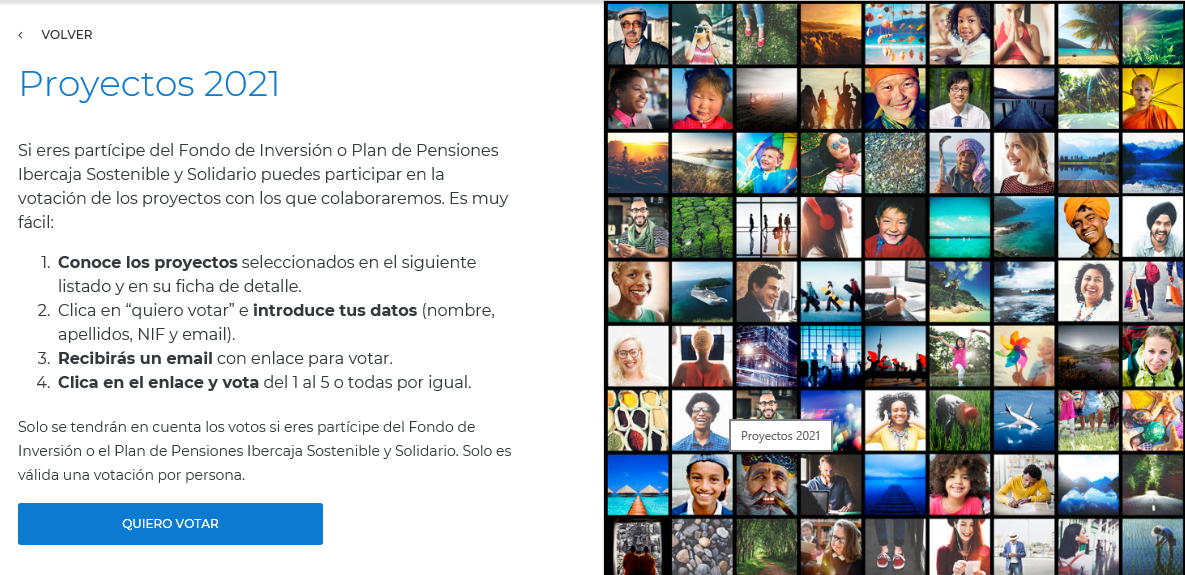 El único medio para poder realizar el voto es el enlace siguiente: https://www.ibercaja.es/tu-dinero-con-corazon/proyectos-solidarios/proyectos-solidarios-detalle/proyectos-solidarios-2021/