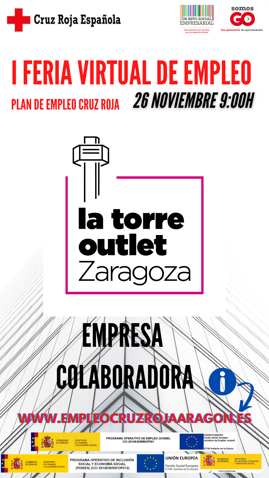 Un nuevo concepto de centro comercial ha abierto recientemente sus puertas en Zaragoza y han decidido aprovechar el escaparate de la Feria Virtual de Empleo de Cruz Roja, para mostrar su compromiso con el empleo. Contaremos con la presencia de Torre Outlet como una de las empresas que atenderá personas con su stand .